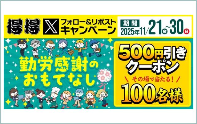うどんチェーン得得がXキャンペーン11/21~30 抽選で100名に500…