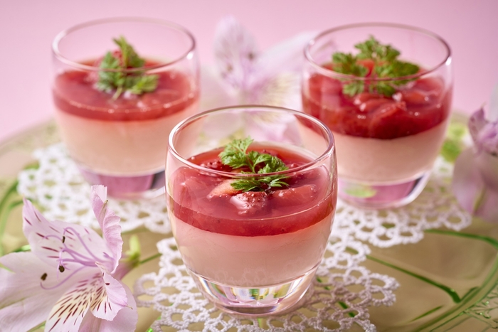 いちごの風味のプリンに、いちごのソースをトッピングしています。見た目も鮮やかなデザートです。