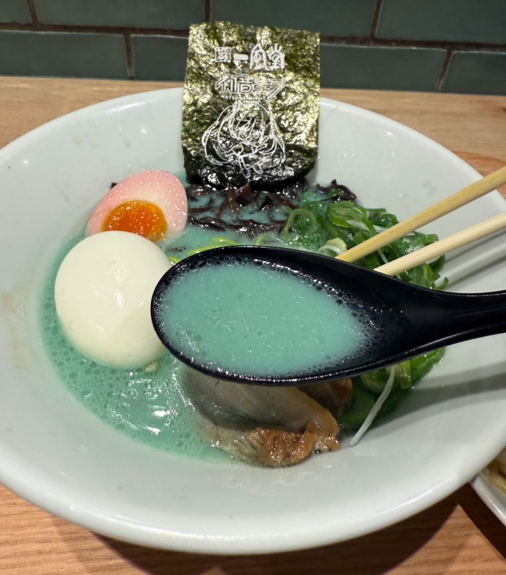 初音ミクがプリントされた海苔がのったラーメン、やはり目を引くのは、ブルーグリーンのとんこつスープ!